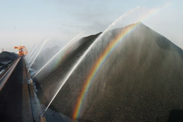 1月25日,秦皇島港使用經(jīng)環(huán)保設(shè)備處理的中水對煤堆進行“洗澡”防塵。