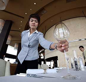 10日,服務員在泰國曼谷的一家餐廳擺放餐具。泰國近日推出11道菜的天價節(jié)日套餐,價格高達每人29000美元。新華社/法新