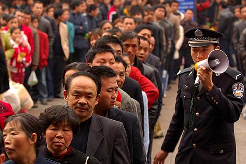 2月24日,一名鐵路公安民警在重慶火車站購票隊伍旁維持秩序。當日是農歷正月初七,重慶火車站迎來節后首個農民工出行高峰。據重慶火車站負責人介紹,當日重慶站預計發送旅客3.6萬人,旅客以農民工為主。
