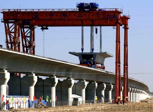 4月10日,京津城際軌道交通天津段正在進行架梁作業。目前京津城際軌道交通線路正在緊張施工中,這條從北京南站東端引出、直至天津站的快速鐵路,全長115公里,將于2008年7月投入運營,區間列車運行時長為30分鐘。