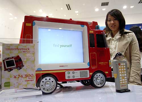 12日,在日本首都東京商業街六本木的一家電器商店,顧客選購青蛙造型的液晶電視。這家商店最近新推出了一系列薯條、手提包、直升機、消防車等卡通玩具造型的液晶電視,電視大小從9.6英寸到42英寸不等,售價比普通電視稍高一點,成為很多家長裝飾兒童房間的選擇。