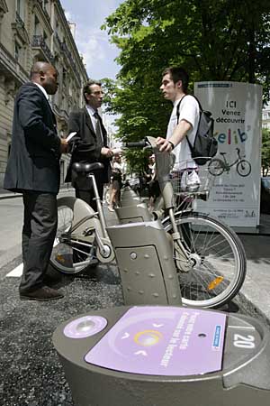 13日,法國巴黎市政廳工作人員在街頭展示“自助自行車”。為了鼓勵(lì)更多市民采取環(huán)保的交通方式出行,到7月15日,將有10648輛自行車被投放到巴黎的750個(gè)車站。租借這些自行車的人們可以在其他車站還車,非常方便。