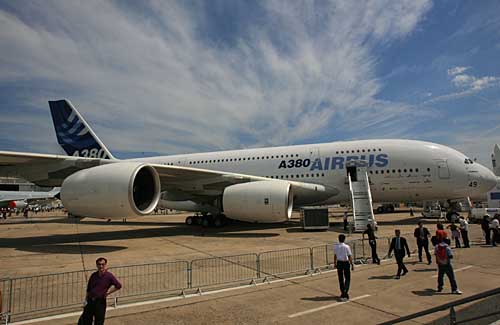 19日,一架空中客車A380在法國巴黎的國際航空航天展上展出。空客A380是目前世界上載客量最大的客機,目前的訂單已達173架。