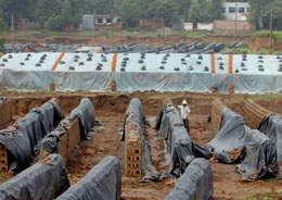 6月23日,工人在河南省上蔡縣肖李王村一個亂占耕地的磚瓦窯場工作。據(jù)介紹,河南省上蔡縣原有磚瓦窯場171座,占用耕地5600多畝,年消耗黏土資源40萬立方米。2007年5月,該縣強制拆除了部分非法磚瓦窯場,但一些非法窯主利欲熏心,頂風違紀,不少磚瓦場又死灰復燃。