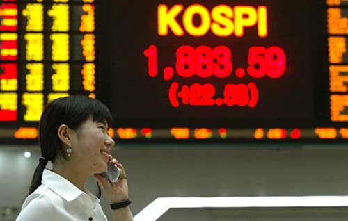 9日,一名女青年在韓國首爾一證券市場里打電話。當天,韓國首爾股市綜合指數收于1883.59點,比前一個交易日上漲了22.58點,再創歷史新高。