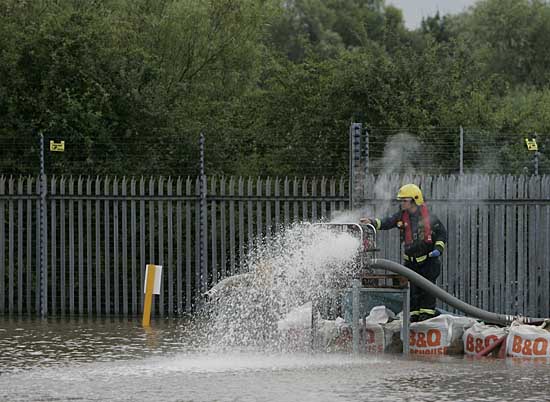 7月23日,在英國格洛斯特城的威爾翰發電站,救災人員用水泵抽水。由于近日連降大雨,英國兩大河流之一的塞文河水位遠超往年正常水平。23日,塞文河洪峰經過格洛斯特城,而為切爾滕納姆市與格洛斯特郡提供電力的威爾翰發電站面臨被洪水淹沒的威脅。為此英國有關部門已緊急投入救援工作。