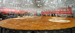 21日,在沈陽揭幕的首屆中國烘焙食品節上,10位月餅大師聯手現場制作的直徑大約八米的超級大月餅亮相。對于這樣的商業行為,有人認為是“商業創意”,也有人責問“工程浩大”、“徒費錢糧”,爭議之聲不斷。據介紹,“超級大月餅”皮和餡的重量至少有10噸。圖為新制作完成的大月餅。