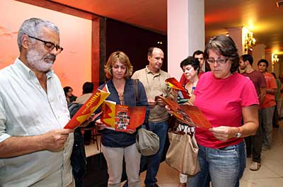 23日,在巴西里約熱內盧,當地電影觀眾查看“中國聚焦”系列電影的介紹。當天,作為里約電影節重要組成部分的“中國聚焦”單元舉行開映儀式,《云水謠》、《滿城盡帶黃金甲》等21部中國影片將與巴西觀眾見面。