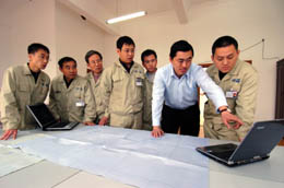 老工業基地哈爾濱市加快推進新型工業化進程,正在改變過去“雁南飛”、“雁外飛”的人才外流現象,吸引了越來越多的人才回鄉創業。歸國華僑、青年企業家尚宇參與創辦的哈爾濱四海集團是一家創新型高科技僑屬企業,擁有自主知識產權成果30余項,平均每季度都會創造出一種填補國內空白的新產品。目前,該企業生產的智能機器人、數控機床和自動化生產線,全部擁有自主知識產權,替代進口產品并遠銷新加坡、馬來西亞、俄羅斯等十幾個國家。圖為年僅33歲的尚宇(右二)帶領著科研人員在進行新產品研發。 |