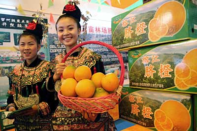 11月7日,工作人員在展示貴州榕江縣出產的臍橙。