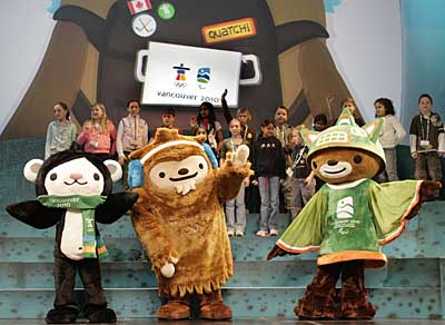 27日,2010年溫哥華冬季奧運會和殘奧會吉祥物揭曉,它們是根據當地神話傳說所創作的3個卡通形象。其中,冬奧會的吉祥物是名叫米加的北極熊和名叫魁特奇的北美野人,而冬季殘奧會的吉祥物則是名叫蘇米的雷鳥精靈。這是魁特奇(中)、米加(左)和蘇米在揭曉儀式現場。