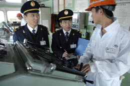 12月18日,黃驊海事局兩名工作人員在一艘輪船上向船員征求航道的有關改進意見。近年來,河北省黃驊海事局針對黃驊港航道狹長特殊的復雜環境和易引起船舶擱淺事故的實際情況,主動與港口及港航企業、地方政府、船舶代理部門、公安邊防和航標部門等單位溝通聯系,通過建立相互之間平等訴求、溝通、協商機制和發生海上交通、污染事故緊急會商制度、聯合執法制度,各項安全生產指標均得到有力保證。