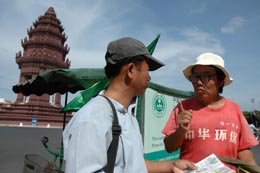 12月20日,在柬埔寨首都金邊的獨立碑前,來自中國江蘇的董寶玉(右)向當地人散發環保資料。59歲的董寶玉騎三輪車于10月3日從中國進入越南,本月12日抵達柬埔寨,一周后赴泰國。他的計劃是從亞洲開始,騎三輪車走遍世界,以此呼吁人們保護環境。