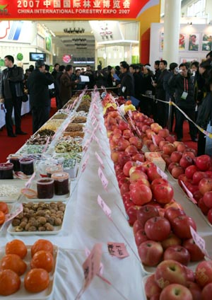 12月20日拍攝的各種參評奧運推薦果品的水果、食品。當日,2007中國國際林業博覽會在北京農業展覽館開幕。本屆林博會圍繞“建設現代林業,促進產業發展,為全社會奉獻更多更好的生態產品”為主題,展示了林業新技術、新產品和新成果。