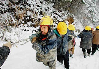 耐張段的塔位均在山頂、山脊或山梁上,周圍地形十分陡峭,道路狹窄難行,有的地方甚至要“攀著樹枝上下”。 目前現(xiàn)場積雪厚達30多厘米,許多地方踩下去到人的膝蓋。葉義德介紹說,為解決山區(qū)道路的運輸問題,搶險指揮部安排人力鏟除到塔位道路的積雪,還緊急聯(lián)系了馬幫,調(diào)運了20匹馬到達現(xiàn)場。 此次搶險的物資共有130多噸,有很多物資的單件重量超過500公斤。余偉告訴記者說,“在險峻的山路上運輸,只能靠肩扛手拉、馬背人拽。”