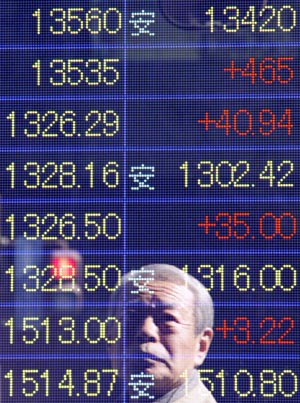 14日,在日本首都東京,一名男子在觀看顯示市場信息的電子顯示牌。日本內閣府當日公布的初步統計數據顯示,去除物價變動因素后,2007年第四季度日本國內生產總值比上季度增長0.9%,按年率計算增幅為3.7%,這是日本經濟連續第二個季度出現增長。新華社/路透