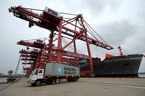 一輛集裝箱卡車駛出寧波港集團有限公司北侖港區碼頭(2月18日攝)。