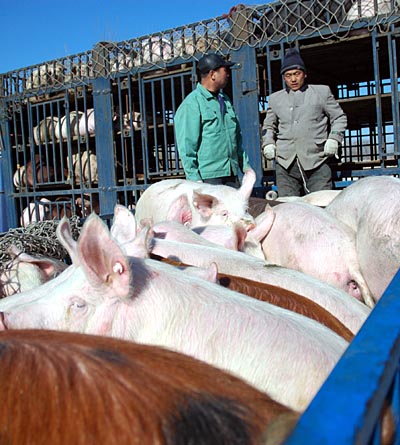 2月27日,吉林省農安縣生豬運銷大戶正在裝車。我國商品糧大省吉林省發揮產糧大省優勢,大力發展養豬業。2007年全省生豬飼養達到3600萬頭,比上年增長11%;出欄2200萬頭,存欄1400萬頭,比上年增長16.67%。其中活豬外銷量達到800多萬頭,400多萬頭制成肉制品銷往省外。