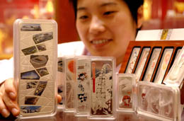 4月22日,北京菜百商場的工作人員展示奧運彩色銀條。當(dāng)日,由北京奧組會授權(quán)、中國金幣總公司發(fā)行的奧運彩色銀條在北京、上海、廣州等地同步發(fā)售。這套奧運彩色銀條共有7種規(guī)格,涵蓋了會徽、場館、吉祥物、開幕式、圣火傳遞等重要奧運標(biāo)識及標(biāo)志性事件。