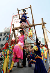 5月3日,來自云南怒江傈僳族自治州的傈僳族青年在昆明南屏街頭表演四人轉秋千。