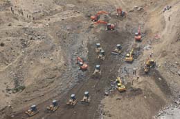 28日,大型機械在唐家山堰塞湖搶險現場進行泄流槽施工。