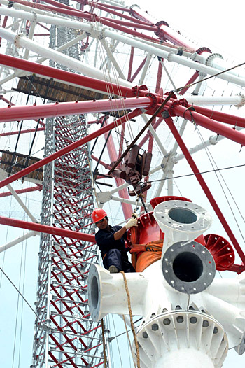 5月27日,福建省第二電力建設公司的建設者在128.5米高的海上500千伏輸電線路鐵塔上作業。