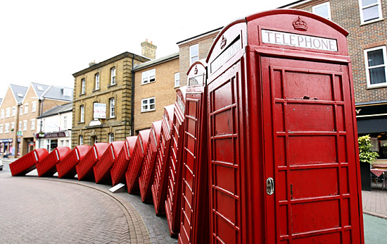 15日,一排像多米諾骨牌一樣依次倒下的傳統(tǒng)紅色電話亭在英國倫敦金斯頓的街頭展示。這件名為《無序》的作品是英國藝術家大衛(wèi)·馬克制作的。新華社/路透