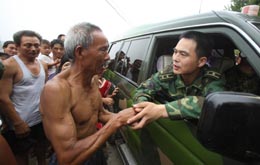 7月20日下午,63歲的木魚鎮受災群眾雍汝進拉住準備撤離的抗震勇士的手久久不放。