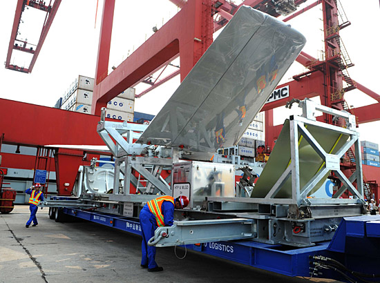 7月24日,裝卸工人在進(jìn)行A320飛機(jī)垂直尾翼裝卸作業(yè)。 當(dāng)日下午,裝載著第一批空客A320大部件在天津港集裝箱公司進(jìn)行接卸作業(yè)。據(jù)了解,該批設(shè)備由德國(guó)漢堡港起運(yùn),共有5件,分別為飛機(jī)的兩個(gè)機(jī)翼、平衡翼、飛機(jī)前部、垂直尾翼、機(jī)艙的尾部,貨值848.94萬(wàn)歐元,貨量92.57噸,首架飛機(jī)將于8月中旬開(kāi)始在位于天津空港加工區(qū)的工廠組裝。 | |