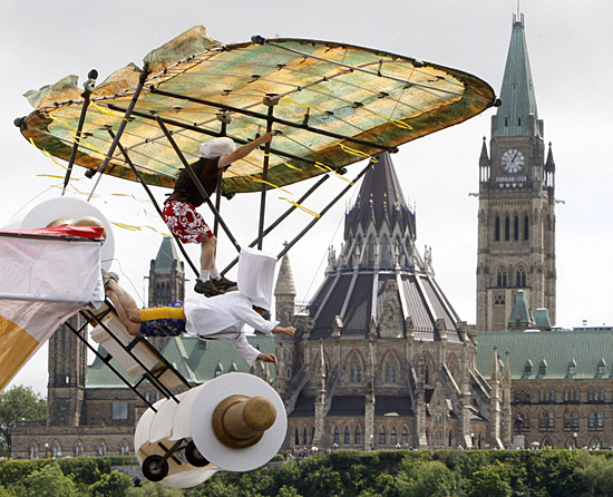3日,在加拿大魁北克的加蒂諾,兩名“飛行員”駕駛自制的“飛機”參加比賽。但他們試飛不久,便因“飛機”失控而跳向渥太華河。新華社/路透