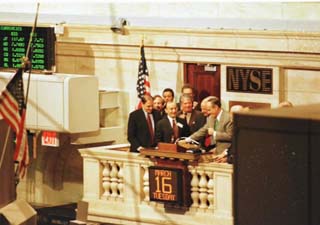 道—瓊斯指數(shù)1999年3月16日盤中突破1萬點(diǎn)大關(guān);3月29日以10006.78點(diǎn)報(bào)收,歷史性地站在萬點(diǎn)之上。圖為16日當(dāng)時(shí)的紐約市長等為紐約證券交易所收盤。