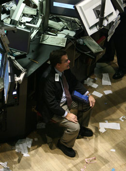 10月6日,一名交易員在美國紐約證券交易所工作時(shí)小憩。當(dāng)日,因?qū)π刨J緊縮和全球經(jīng)濟(jì)放緩的恐慌情緒蔓延,紐約股市三大指數(shù)跌幅全部超過3%,其中道瓊斯指數(shù)收于9955.50點(diǎn),4年來首度跌破10000點(diǎn)關(guān)口。