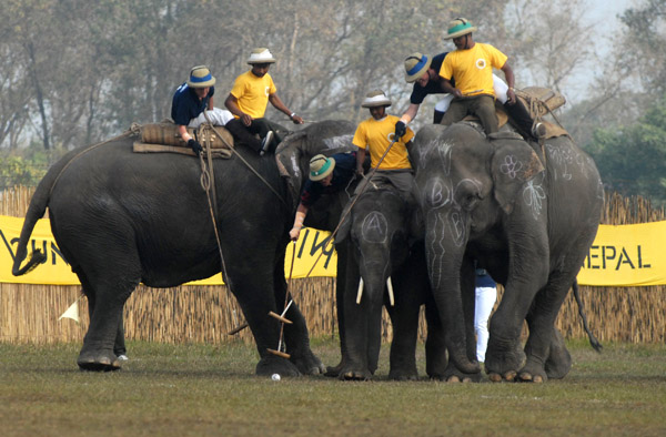 3日,在距尼泊爾首都加德滿都250公里的奇特旺地區(qū)舉行的國際象球錦標賽上,雙方隊員在場上爭搶。象球與普通的馬球相似,但是場地小一些,每方出4名參賽者進行兩回合各10分鐘的比賽。騎在大象背上的球員揮動長桿擊球。如果大象用它的鼻子拾起球則會被判犯規(guī)。新華社/法新