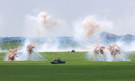 7月23日上午,中方參演裝甲戰(zhàn)車在進(jìn)攻中發(fā)射電子干擾彈。 當(dāng)日,中央軍委委員、中國(guó)人民解放軍總參謀長(zhǎng)陳炳德上將、俄羅斯聯(lián)邦國(guó)防部第一副部長(zhǎng)兼武裝力量總參謀長(zhǎng)馬卡羅夫大將,在沈陽(yáng)軍區(qū)洮南合同戰(zhàn)術(shù)訓(xùn)練基地共同觀看了中俄聯(lián)合軍演,并在野營(yíng)村與參演官兵共進(jìn)午餐。