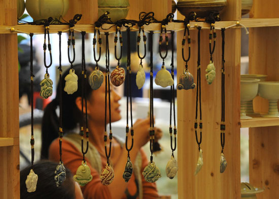 景德鎮樂天陶社主辦的創意集市目前成為大學生自主創業的一塊樂土。今年景德鎮國際陶瓷博覽會期間,樂天陶社于17日—21日舉辦專場活動,吸引了中外眾多愛好者駐足。日均成交額達七萬余元,為大學生自主創意提供了一個很好的商業平臺。圖為大學生自主創意的陶瓷首飾。