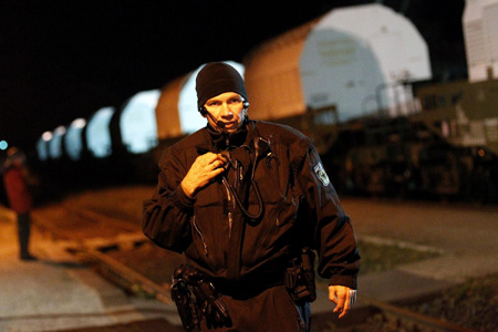 11月8日,在德國丹嫩貝格,一名防暴警察在運載核廢料的列車旁工作。 運載核廢料的列車當日抵達終點站德國丹嫩貝格。列車從法國出發以來,反核抗議者在沿途鐵路用各種手段阻止列車行進。數千名抗議者7日與警方沖突升級,雙方陷入“混戰”。