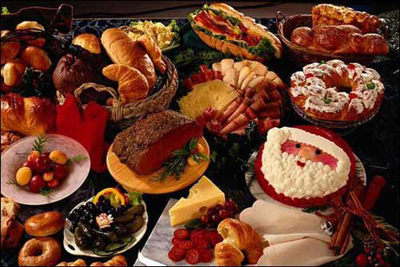 英國的圣誕大餐極其豐富,包括燒豬、火雞、圣誕布丁、干果餡餅等。據說吃英國圣誕火雞圣誕火雞這個習俗,已有300多年歷史。一般英國家庭都喜愛自行烹調火雞,將大量的蔬果如甘筍、西芹、洋蔥、栗子等,塞進十來磅的火雞肚子里,再在表層抹上多種香料,然后才放入焗爐烤。圣誕布丁亦是傳統食品,傳統的圣誕布丁非常甜,吃一小角已心滿意足了!烹調時,全家人都會參與,象征團聚、和諧,并會在攪拌面團時許愿,據說需以順時針方向攪,轉錯方向便不吉利。最后藏入一枚硬幣,誰吃到便獲得一年好運!
