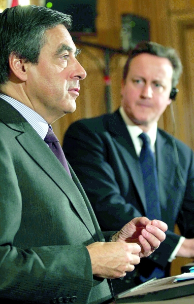 法國總理菲永(左)13日在倫敦和英國首相卡梅倫共同出席新聞發布會時表示,歐元區各成員國,尤其是德國和法國,愿意為了歐元區的經濟穩定竭盡所能。此前,菲永對英國《泰晤士報》表示,將敦促英國進一步支持歐洲一體化以拯救歐元,否則,如果歐元崩潰,則英國將面臨自身經濟陷入災難的風險。但卡梅倫當天回應說,英國將不會加入有關的歐元救助新機制。