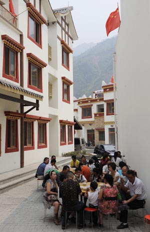 到映秀鎮(zhèn)旅游的游客們在新建好的民房前聚餐。新華社記者