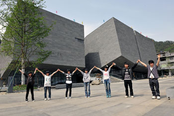 青川縣關莊中學的學生在青川縣地震博物館前拉起“人鏈墻”。新華社記者
