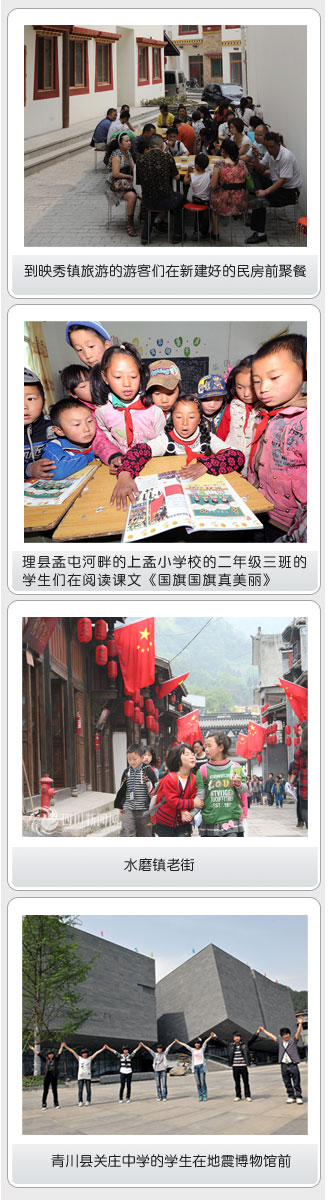 | 從映秀到三江,從魚子溪到東河口,一幢幢新住房拔地而起、一條條新道路蜿蜒綿長、一所所新學校巋然屹立、一個個新城鎮煥發生機……昔日山河破碎的震中地震災區,如今都已涅槃重生,創造了人類戰勝特大自然災害、重建美好新家園的奇跡。[詳細] |