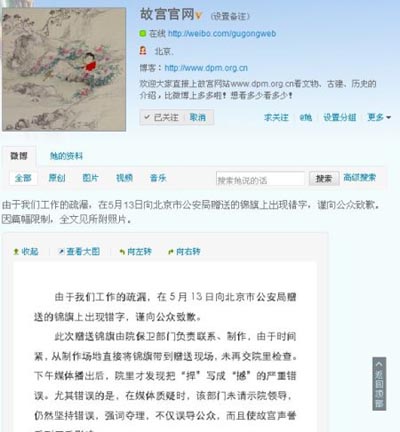 故宮博物院16日通過微博就其向北京市公安局贈送錦旗出現(xiàn)錯字一事,向公眾道歉。故宮在這份聲明中說,此次贈送錦旗由保衛(wèi)部門負(fù)責(zé)聯(lián)系、制作,贈送前未“交院里檢查”。在媒體質(zhì)疑時,該部門未請示院領(lǐng)導(dǎo),仍然堅持錯誤,強詞奪理,不僅誤導(dǎo)公眾,而且使故宮聲譽受到嚴(yán)重影響。 故宮博物院日前向北京市公安局贈送錦旗,感謝警方迅速破獲展品被盜案。而一面寫有“撼祖國強盛,衛(wèi)京都泰安”的錦旗,引起網(wǎng)友質(zhì)疑,稱“撼”為錯別字,正確用字應(yīng)為“捍”。面對質(zhì)疑,接受媒體采訪的故宮相關(guān)負(fù)責(zé)人解釋說:“‘撼’字沒錯,顯得厚重。跟‘撼山易,撼解放軍難’中‘撼’字使用是一樣的。”此舉引發(fā)外界更大的質(zhì)疑,有語言文字方面的專家表示,“撼”字在這里肯定是錯別字。 16日,故宮博物院通過微博對外發(fā)布聲明,就此事向公眾道歉。 故宮方面的聲明全文如下。 由于我們工作的疏漏,在5月13日向北京市公安局贈送的錦旗上出現(xiàn)錯別字,謹(jǐn)向公眾致歉。 此次贈送錦旗由院保衛(wèi)部門負(fù)責(zé)聯(lián)系、制作,由于時間緊,從制作場地直接將錦旗帶到贈送現(xiàn)場,未再交院里檢查。下午媒體播出后,院里才發(fā)現(xiàn)把“捍”寫成“撼”的嚴(yán)重錯誤。尤其錯誤的是,在媒體質(zhì)疑時,該部門未請示院領(lǐng)導(dǎo),仍然堅持錯誤,強詞奪理,不僅誤導(dǎo)公眾,而且使故宮聲譽受到嚴(yán)重影響。 事情發(fā)生后,院里即時進行認(rèn)真調(diào)查,給予當(dāng)事人嚴(yán)肅的批評教育,并采取了補救措施。故宮博物院現(xiàn)正組織全院各部門舉一反三,吸取教訓(xùn),堵塞漏洞,增強工作責(zé)任心,進行全面整改。