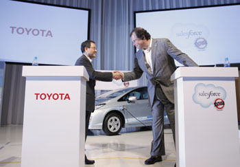 5月23日,日本豐田汽車公司總裁豐田章男(左)和美國Salesforce.com網(wǎng)站首席執(zhí)行官馬克·貝尼奧夫在東京共同出席新聞發(fā)布會。 當(dāng)日,日本豐田汽車公司和美國Salesforce.com網(wǎng)站在東京召開新聞發(fā)布會,宣布將建立一個面向豐田消費(fèi)者的私人社交網(wǎng)站“豐田之友”,該網(wǎng)站將與即將上市的豐田電動車及插入式混合動力車同時發(fā)布。