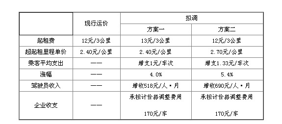 方案一:起租費由12元/3公里調整為13元/3公里,超起租部分運價標準和加價部分計費規(guī)則不變。