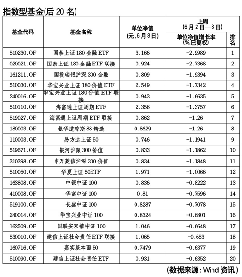 國泰基金管理有限公司旗下的,2011年3月成立的國泰上證180金融ETF以-3.0%的凈值增長率成為本周(6月2日-8日)指數型基金收益倒數第一,其今年以來年漲幅為-11.4%。