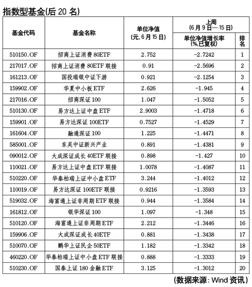 招商基金管理有限公司旗下的,2010年12月成立的招商上證消費80ETF以-2.72%的凈值增長率成為本周(6月9日-15日)指數(shù)型基金收益倒數(shù)第一,其今年以來年漲幅為-9.38%。