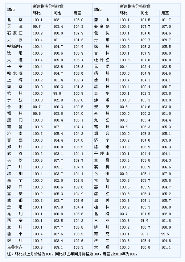 3、2011年5月份,59個(gè)城市的新建住宅價(jià)格指數(shù)根據(jù)網(wǎng)簽數(shù)據(jù)計(jì)算,其他11個(gè)城市根據(jù)統(tǒng)計(jì)系統(tǒng)房地產(chǎn)開(kāi)發(fā)統(tǒng)計(jì)報(bào)表中各個(gè)項(xiàng)目的分類銷售面積和金額數(shù)據(jù)計(jì)算。59個(gè)網(wǎng)簽數(shù)據(jù)城市分別是:北京、天津、石家莊、太原、呼和浩特、沈陽(yáng)、大連、長(zhǎng)春、哈爾濱、上海、南京、杭州、寧波、合肥、福州、廈門(mén)、南昌、濟(jì)南、青島、鄭州、武漢、長(zhǎng)沙、廣州、深圳、南寧、海口、重慶、成都、貴陽(yáng)、昆明、西安、蘭州、西寧、銀川、烏魯木齊、秦皇島、包頭、丹東、吉林、牡丹江、無(wú)錫、揚(yáng)州、徐州、溫州、金華、泉州、九江、洛陽(yáng)、平頂山、宜昌、岳陽(yáng)、惠州、湛江、韶關(guān)、桂林、北海、三亞、瀘州、南充。5月份新增加的城市是溫州。