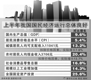 上半年“9.6%+5.4%”的組合,對于中國經(jīng)濟(jì)而言,不僅意味著經(jīng)濟(jì)增長繼續(xù)保持穩(wěn)定,更意味著價格上漲將形成倒逼機(jī)制,加快結(jié)構(gòu)調(diào)整和發(fā)展方式轉(zhuǎn)變。