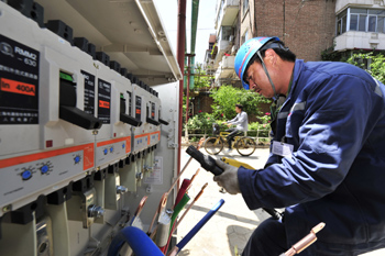 據預測,天津市今夏最大用電負荷將出現在7月下旬或8月上旬,最大電力缺口可達150萬千瓦。圖為國家電網天津城西供電分公司配電施工人員在南開區府湖里居民小區進行低壓開關柜升級改造。新華社發(吳宣述攝) |