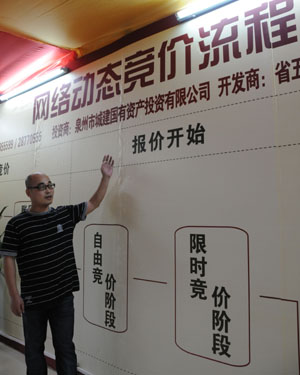 據(jù)介紹,海城花苑項(xiàng)目網(wǎng)售流程相對簡單,購房意向人只需向泉州市產(chǎn)權(quán)交易中心按每套房屋5萬元的標(biāo)準(zhǔn)交納保證金,且交易保證金的匯款人名稱要與競買人名稱一致。雙方簽署相關(guān)承諾書后,即可參加競買。圖為負(fù)責(zé)海城花苑項(xiàng)目銷售的工作人員介紹網(wǎng)絡(luò)動(dòng)態(tài)競價(jià)流程。